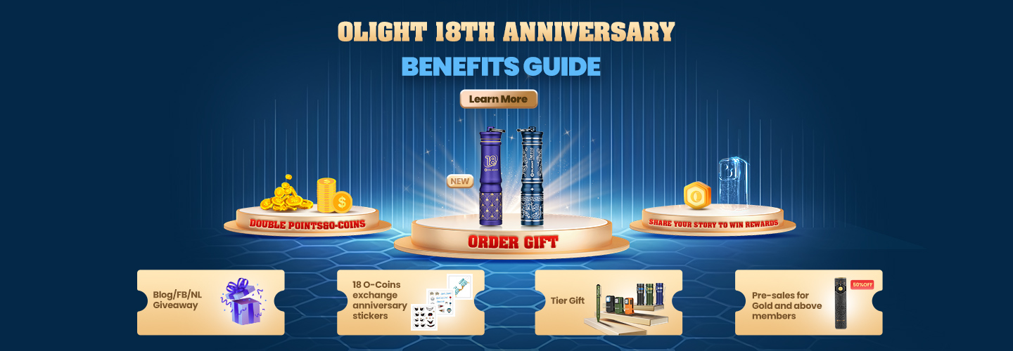 "Eighteen years of breakthroughs, adventures, and trust—OLIGHT’s legacy shines brighter because of YOU. Don’t miss your chance to ignite savings: Explore limited-time anniversary bundles, unlock member-exclusive gifts, and join the #OLIGHT18 celebration across social platforms! Hurry—these deals fade fast, just like the dark. 🎉 Light Your Way with 18 Years of Innovation. 🔦✨