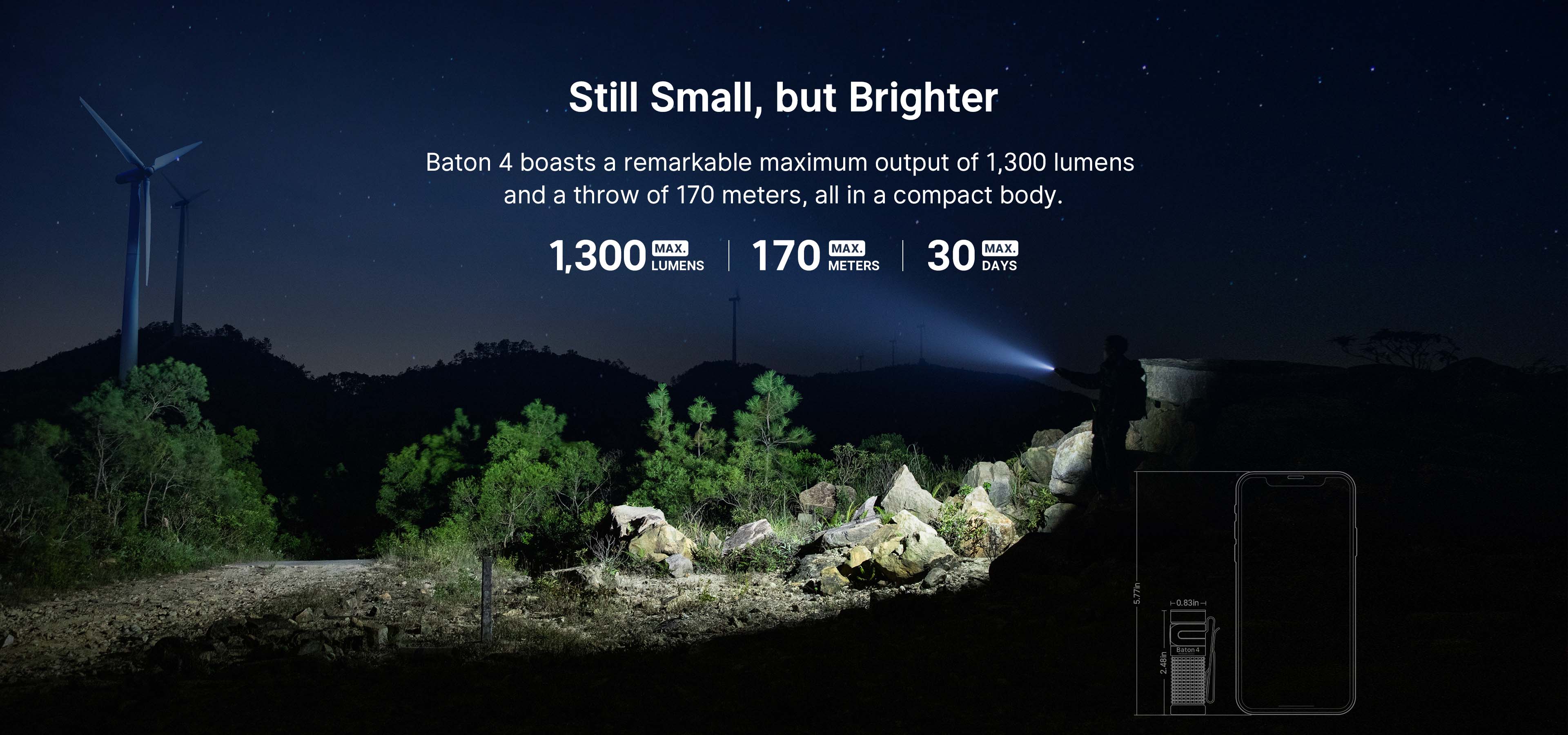 The Baton 4 is an upgraded version of the Baton 3. It features a high-performance LED and TIR lens, delivering an impressive maximum output of 1,300 lumens and a beam distance of 170 meters. The Baton 4 features laser micro-perforated indicators that show the remaining brightness and battery life. The custom-designed charging case has a built-in 5000mAh 21700 battery, providing up to 190 days of runtime for Baton 4.