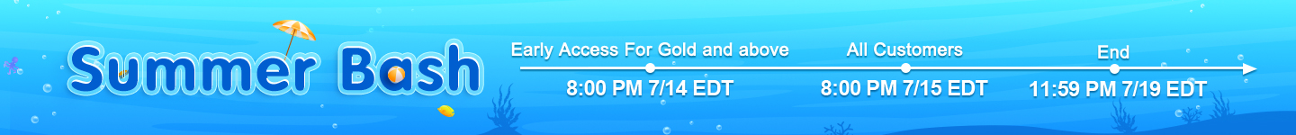 VIP members (Gold and above) have early access to the sale starting at 8:00 PM 7/14 EDT. For all customers, the sale will open at 8:00 PM 7/15 EDT and will be until 11:59 PM 7/19 EDT. Please make sure to mark your calendars for our upcoming Summer Bash!